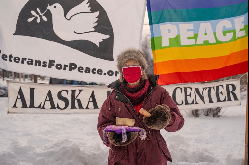 According to Heather Koponen, Alaska Peace Center chair, “An example of the impact the sign has had came when a fellow came to the Alaska Peace Center’s annual booth at the 10-day-long Tanana Valley State Fair and proceeded to tell us about the extraordinary human costs incurred by our military budget, including asking us, ‘Did you know that 3% of the U.S. military budget could end starvation on Earth?’