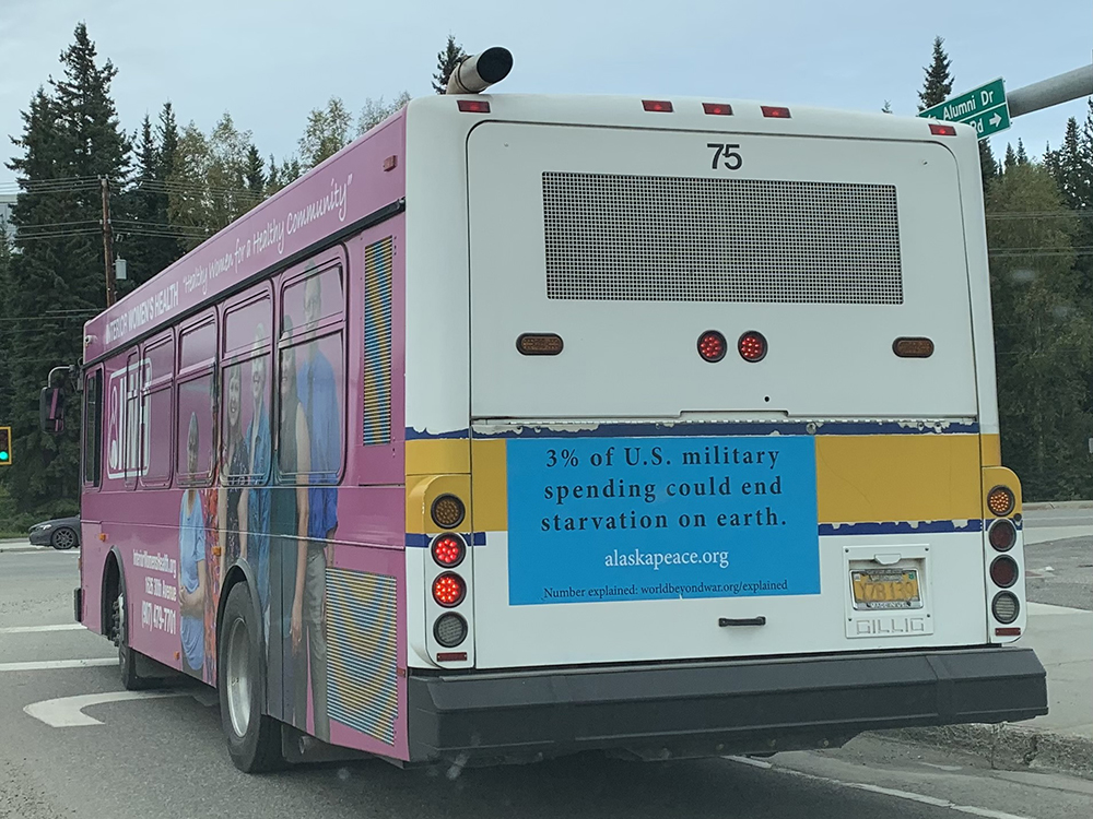The image and story of a Fairbanks public bus with a thought-provoking message is being publicized around the world via World BEYOND War, which includes “Tens of thousands of people in more than 200 countries worldwide who have signed onto World BEYOND War’s Declaration of Peace, including 1000+ organizational pledge signers, [with] 53 chapters in 39 countries and maintain partnerships with 122 affiliates around the world. Here it is: